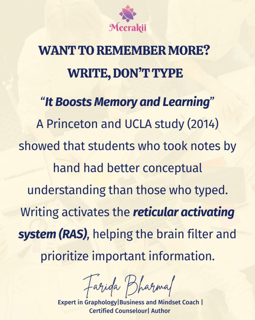 Why? Because handwriting activates the Reticular Activating System (RAS)—a part of the brain that filters and prioritizes information. When you write, your brain decides what matters. You’re not just copying—you’re processing, integrating, and encoding meaning.
